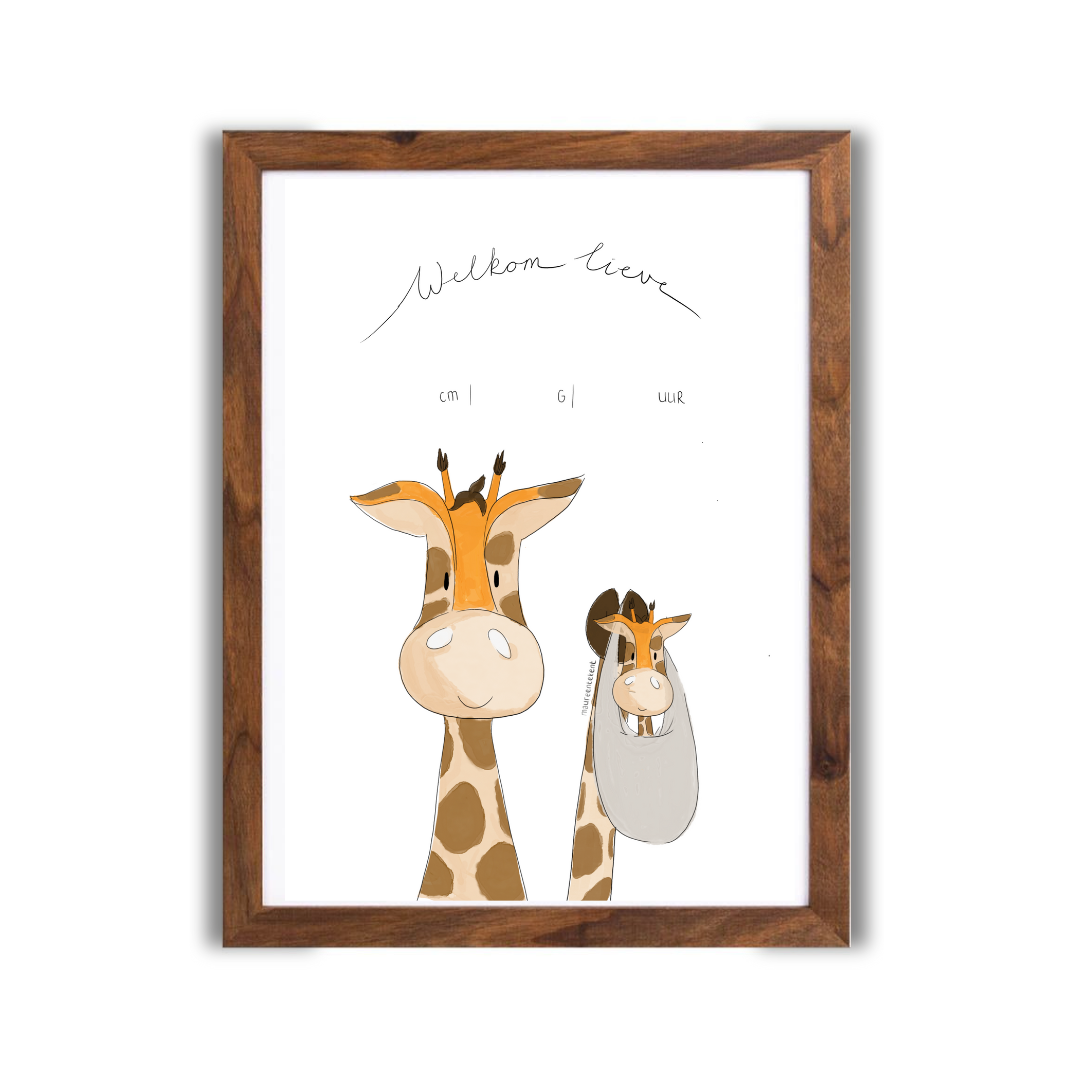 Bekijk hier de ‘Babykamer Giraf’ poster van Maureen tekent! Deze ‘Babykamer Giraf’ poster van Maureen tekent wordt verkocht inclusief walnootkleurige, houten poster. In de exclusieve webshop van Maureen tekent heb jij voor iedere gelegenheid het juiste cadeau in huis! De posters bevatten een minimalistische, kleine & lieve illustratie. De posters en kaarten stralen vreugde & blijdschap uit. Perfect dus om een glimlach op het gezicht van de ontvanger te toveren en om een grappig, onvergetelijk of belangrijk moment in het leven samen te delen. Verwen vrienden en familie (OF jezelf) met een speciale boodschap op jouw lieve poster of kaartje! Op de invulposters kun je de naam van het kindje en de lengte, het gewicht en de tijd van de geboorte zelf opschrijven. Een super persoonlijk extraatje in de babykamer of cadeautje!