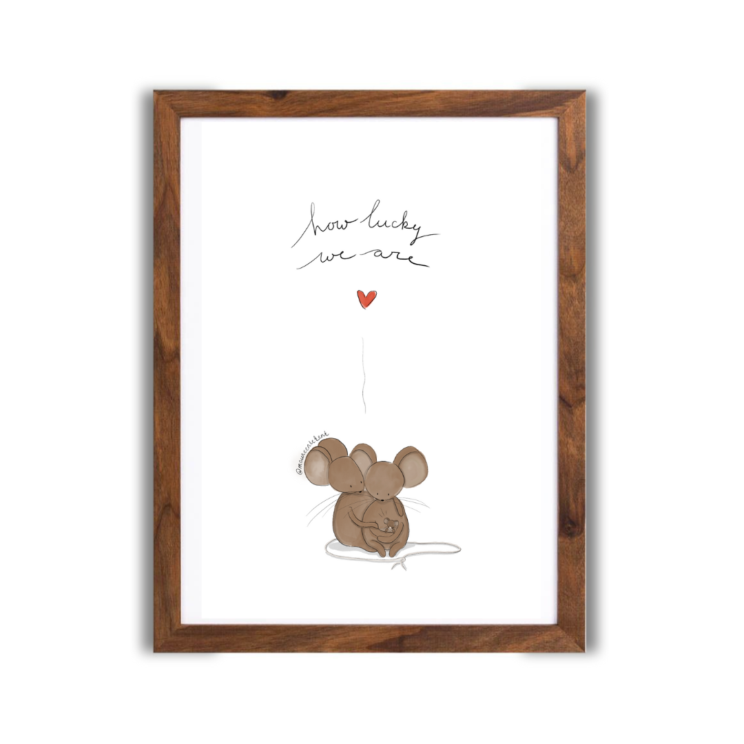 Bekijk hier de ‘Lucky family’ poster van Maureen tekent! Deze ‘Lucky family’ poster van Maureen tekent wordt verkocht inclusief walnootkleurige, houten poster. In de exclusieve webshop van Maureen tekent heb jij voor iedere gelegenheid het juiste cadeau in huis! De posters bevatten een minimalistische, kleine & lieve illustratie. De posters en kaarten stralen vreugde & blijdschap uit. Perfect dus om een glimlach op het gezicht van de ontvanger te toveren en om een grappig, onvergetelijk of belangrijk moment in het leven samen te delen. Verwen vrienden en familie (OF jezelf) met een speciale boodschap op jouw lieve poster of kaartje!
